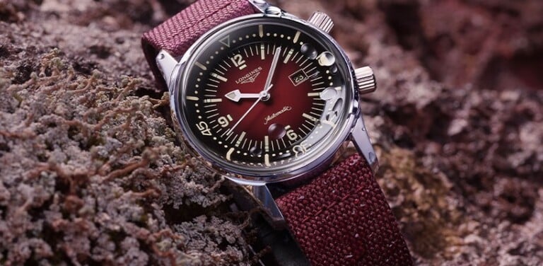 Take a look at the new Longines Legend Diver watch with a rich red dial and matching