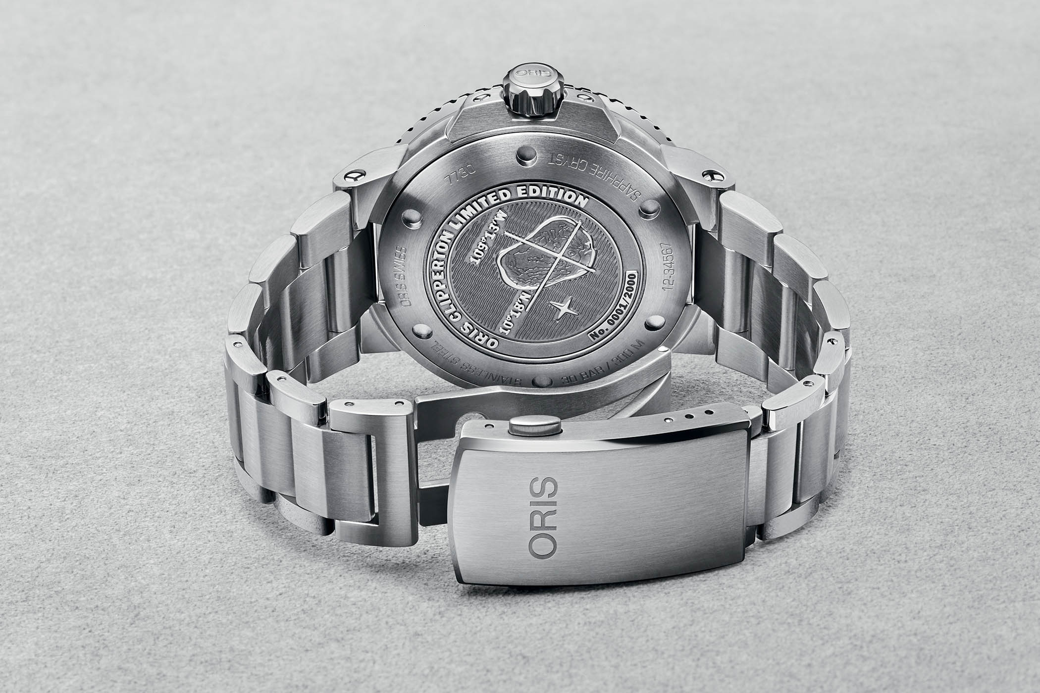 Turn the Oris Clipperton Limited Edition watch around and you are greeted to a stunning engraved case back displaying an outline of Clipperton island and its coordinates. To complete the diver aesthetic, the timepiece is completed by either a black rubber strap or a stainless steel bracelet both fastened by a folding clasp buckle with divers extension.
