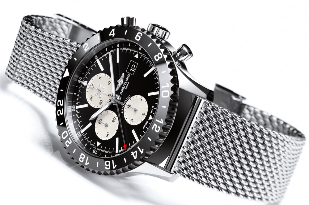Although Pilot’s watches today tend to accentuate all their technical features, the new Chronoliner has played down any fancy modifications and stripped it back to basics with a bold and archetypal piece to add to their already well established aeronautical range. The new Chronoliner has similar characteristics from many other models of the past, including that of the co-pilot and the 75 AVI stemming back from the 1950’s. This new innovation with piston pushers and a 3 o’clock window to show the date takes us back to an era when Breitling really pushed forward with their skilled engineers to construct a rigid AOPA, reliable piece of equipment for accurate speed. Other advantages would allow an easily readable display for fuel consumption and time reading. The Chronoliner’s coated onyx black hue 24 hour rotating bezel allows any skilled user to read a third time zone, operating on a highly accurate ratcheted system. This new piece offers a Chronograph of the highest quality with counters placed at 12, 6 and 9 o’clock on a panda face for optimal contrast, a look that differentiates itself from that of the Avenger and the Superocean range, where the sub dials are commonly seen at the 3, 6 ad 9 o’clock positions. The Chronoliner also has a 24 hour hand which gently tapers towards the red arrow tip for easy reading and clean white oversized luminous minute and hour hand. Sitting inside the heart of the watch is the calibre 24 using the movement ETA Valjoux 7750 (25 jewels). It beats at an impressive 28,800 vph and is enclosed by 48 millimetres of stainless steel case with solid caseback. Like all Breitling watches, the Chronoliner is COSC certified. Elegantly engraved onto the back of the stainless steel case are two airplanes mounted on top of one another, harking back to Breitling’s historic logo. The model is also 100m water resistant. The choice of either the classic strap or Milanese bracelet is down to personal choice. The latter however clearly adds to the overall vintage look. Just imagine how beautiful this watch would look on a textured brown strap?!