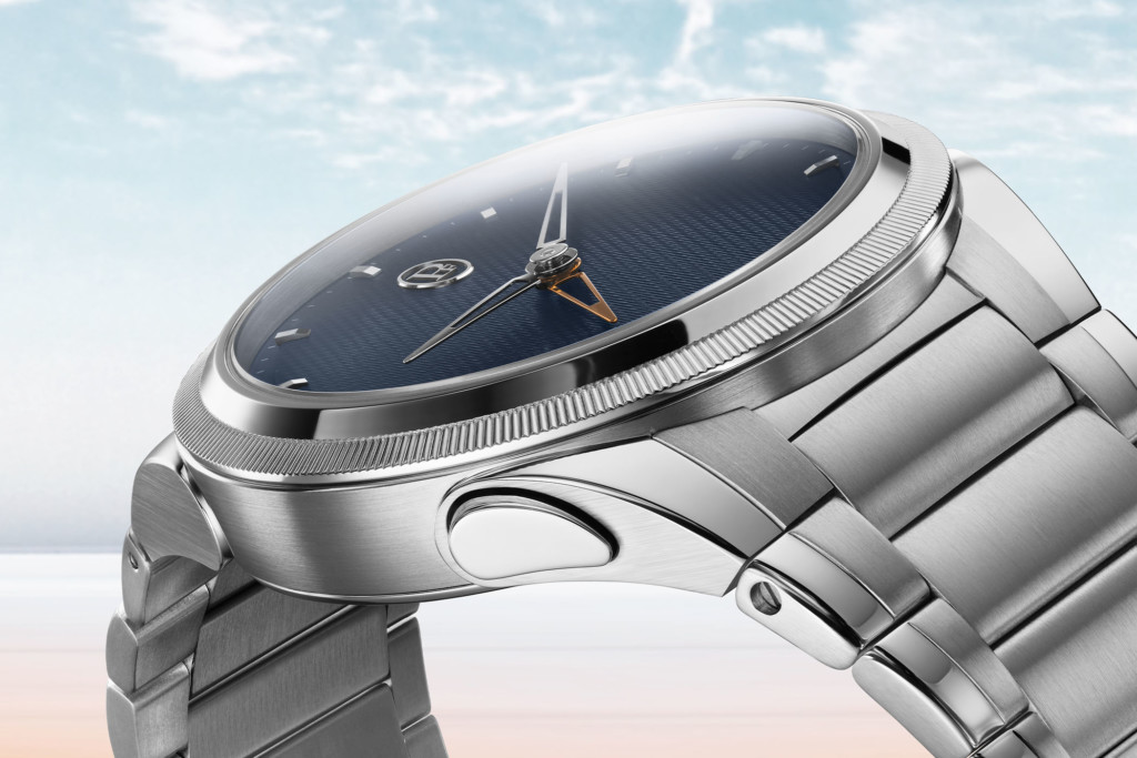 When you’re on home soil and not in need of a second time zone function, the Parmigiani Fleurier Tonda PF GMT Rattrapante watch looks like a simple, two-handed watch almost exact to the Micro Rotor variation launched last August (minus the date window and the addition of the pushers at 3 and 8 o’clock. The case mimics the integrated architecture closely with a 40 millimetre diameter and a 10.7 millimetre thickness engineered from stainless steel with a combination of polished and satin-brushed finishings. On top, the iconic knurled bezel is made of 950 platinum while the crown’s push piece is done in 18ct rose gold for a nice bit of contrast. Also finished in stainless steel is the tapered three-link bracelet closed by a folding buckle.