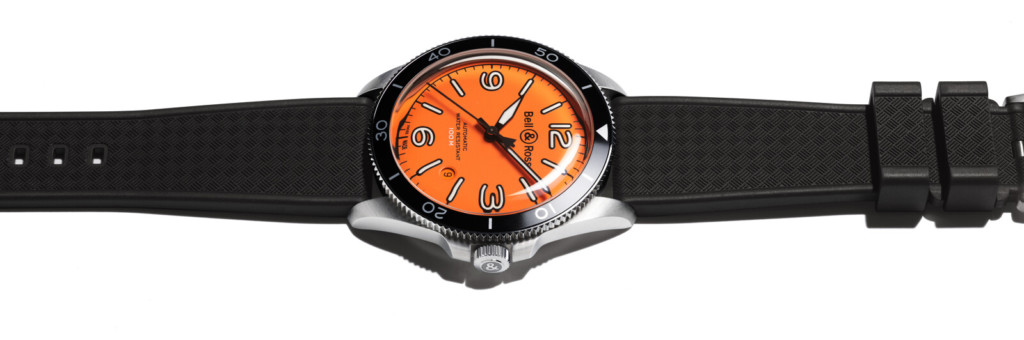Other than the new colour scheme for the dial, the Bell & Ross BR V2-92 Orange watch follows suit to its precursors with a traditionally shaped 41mm stainless steel case with nice proportions, including an 11.5mm height, curved lugs with circular brushing and polished flanks. A screw in crown is added at 3 o’clock, paired with crown guards for additional protection, assisting in a water resistance of 100 metres. This is more than enough for shallow snorkelling and works perfectly alongside the underwater-worthy orange dial and the contrasting black aluminium bi-directional rotating bezel detailed with a 60 minute scale.