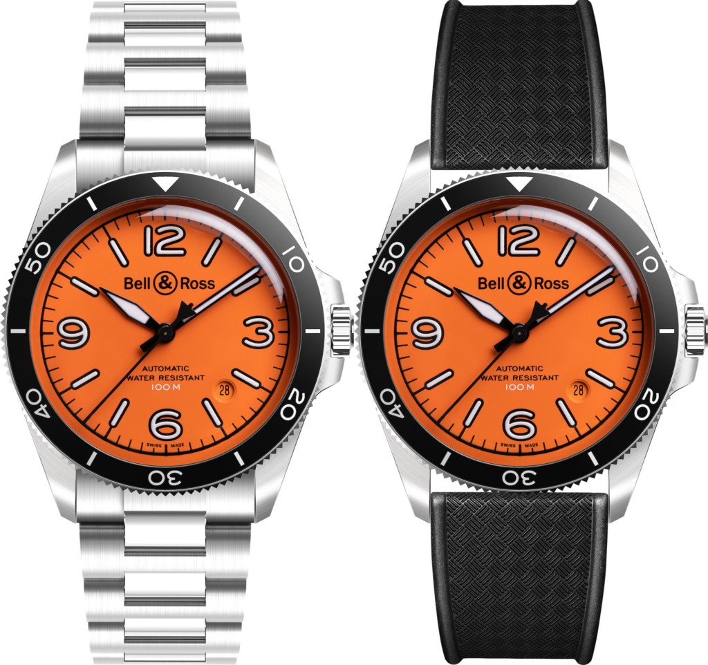 There are two strap options for the Bell & Ross BR V2-92 Orange watch. The first is a stainless steel bracelet with a classic three-link profile, satin-finished surfaces and a folding buckle. The second is a supple black rubber strap secured by a classic satin-finished pin buckle. Both designs fit nicely with the aesthetic of the Bell & Ross BR V2-92 Orange watch, the rubber band bringing out the sporty personality of the orange dial while the steel bracelet is more suited to those preferring of a formal look.