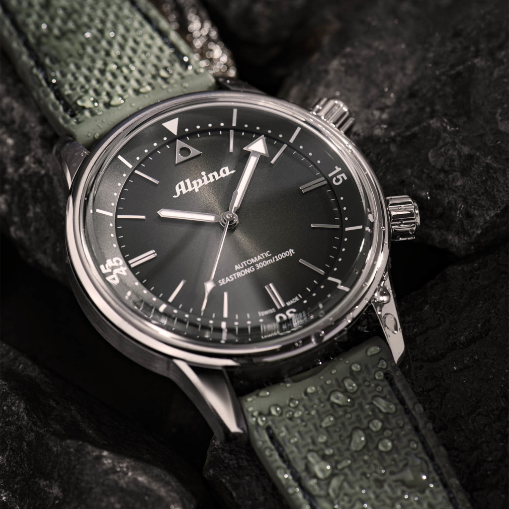 It’s safe to say that the trend for vintage-inspired watches is still strong and holding. Alpina is one of many brands that has chosen sensibly in this region, calling to all those collectors – us included- that struggle to say no to a retro timepiece. The story of the Alpina Seastrong Diver 300 Heritage Green watch that we’re looking at today began in 1969 when the Swiss watch manufacturer introduced its landmark divers watch, the Alpina Diver 10 Seastrong. Equipped with an automatic winding movement and a super-compressor case constructed by the case manufacturer Ervin Piquerez S.A. (EPSA), the design was largely defined by its two crowns, one of which was used to control the internal rotating 60 minute scale bezel. In 2016, Alpina then presented its Seastrong Diver 300 Heritage collection, a modernised version of the original super-compressor models with the same internal bezel and two crowns.