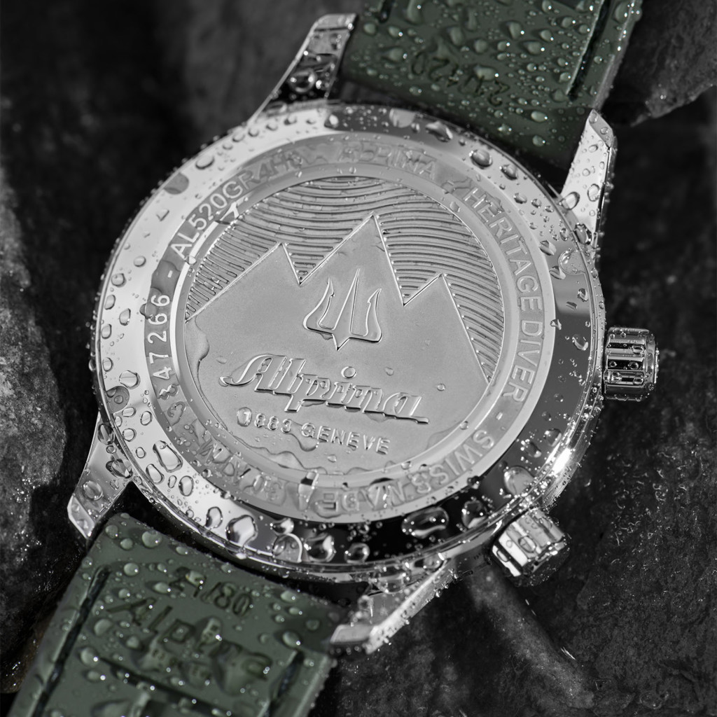 Powering the time-only dial of the Alpina Seastrong Diver 300 Heritage Green watch is the Calibre AL-520, an automatic winding movement based on the Sellita SW200-1. Alongside a frequency of 28,800 vibrations per hour and 26 jewels, we’re promised a healthy power reserve of 38 hours. Completing the green aesthetic of the new Alpina Seastrong Diver 300 Heritage watch is a green rubber strap detailed with a nice supple texture and closed by a classic stainless steel pin buckle.