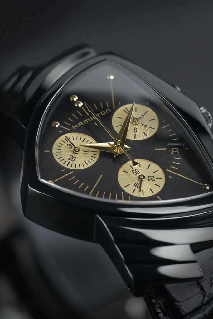 For the last two designs in the Hamilton Black & Gold Capsule collection, we’re taken back to the 1950’s with the Hamilton Ventura. Defined by its exceptionally unique shield-like or guitar-shaped case, this watch is known not only as the world’s first battery-powered watch but the timepiece loved by Elvis Presley. The king of rock famously wore the Hamilton Ventura watch in the 1961 movie Blue Hawaii. Just like the original, the new Hamilton Ventura Chrono Quartz is done in a black and gold.