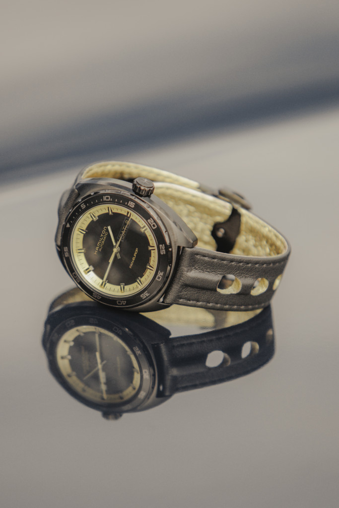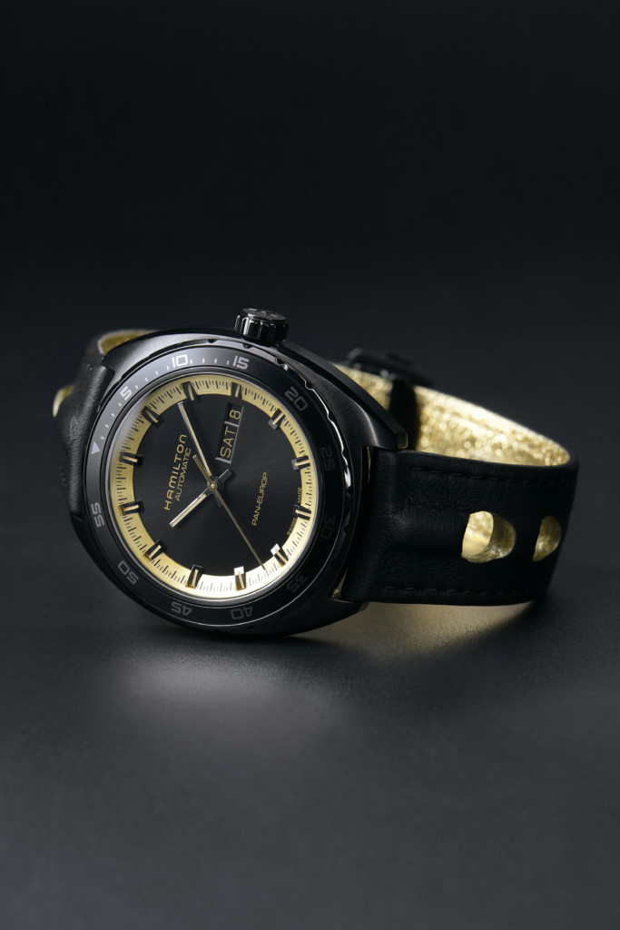 Our personal favourite within the new Hamilton Black & Gold Capsule watch collection is this Hamilton American Classic Pan Europ watch. Still vintage despite its contemporary black and gold colour palette, the design revives the 1970’s aesthetic of the original Hamilton Pan Europ watch which made history as one of the world’s first automatic chronographs. It’s gorgeous cushion-shaped case is finished in the familiar black PVD coating and paired with polished and brushed surfaces, sapphire crystal glass with anti-reflective coating and a rotating bezel. The bezel gives the watch an almost diving-instrument look with a 60 minute scale printed in grey across the black PVD circumference. Sadly, it’s 50 metre water resistant rating doesn’t allow the Hamilton American Classic Pan Europ Black & Gold watch to be any real use for diving.