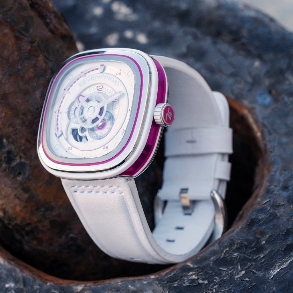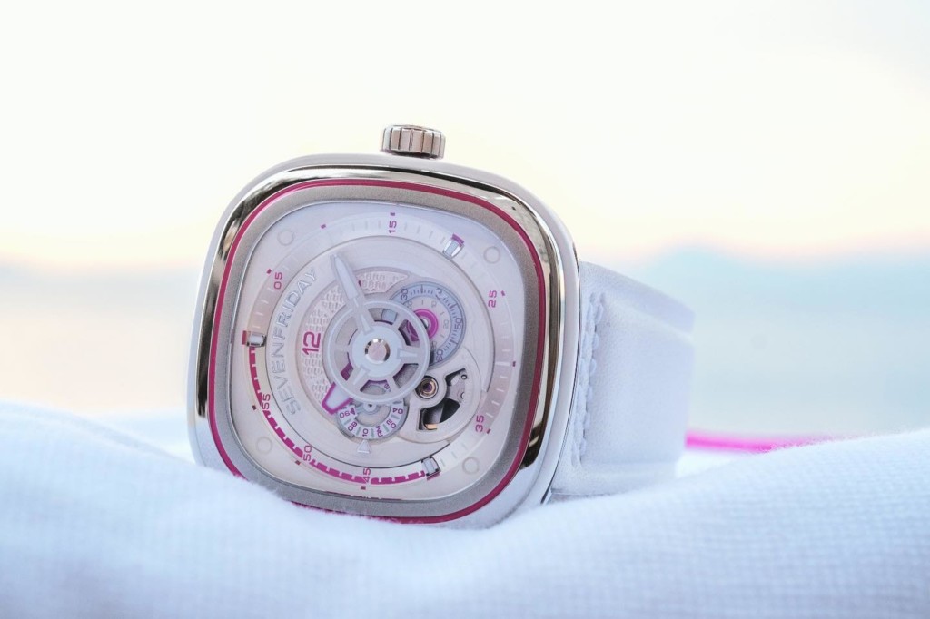 The signature 4-level dial is also handsomely adorned with the new colour palettes with blue and pink making its way across the outer minutes track, predominantly between the 40 to 60 minute section, on the hour hand, AM/PM disc and the small seconds dial. A final splash of colour is also added to the crown where the 7F logo resides. The rest of the dial is contoured with a thin chrome frame and set on an opaline white diamond-cut rhodium ring. The applied indexes at 12, 4 and 8 hours also feature white lume for readability in low lighting.