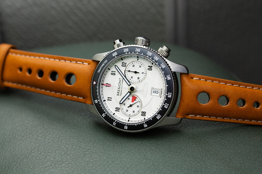 At the centre, the Bremont Jaguar C-Type watch opts for a silver-plated multi-level dial with sunburst decoration and a brushed dial ring. The Jaguar logo is embossed at 6 o’clock parallel to the Bremont emblem at the top, both surrounded by black gloss Arabic numerals and a black minutes track, the latter changes between 8 and 4 o’clock to mirror the aesthetics of a dashboard counter on a Jaguar C-Type car. The dial also reveals white subsidiary dials for the 30 minutes counter and the small seconds with the seconds detailed with a red accent to mimic the original Smiths gauges from the C-type. To suit, the central chronograph seconds hand features a C-Type-inspired needle hand in red. All timekeeping hardware, date window included, is finished in matte black, with the hour and minutes hands treated to blue emission Superluminova.