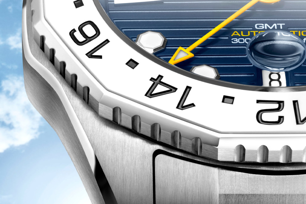 From first sight, the TAG Heuer Aquaracer Professional 300 GMT watch proves to have a different personality to its time-only predecessors. It’s blue, yellow and white colour palette is really nice and according to TAG Heuer was chosen to “represent the sky, the sun, the water and the crashing waves near the shore”. The contrast of the three colours makes reading the array of functions incredibly easy, whether you be on land or exploring the waters of a new time zone.