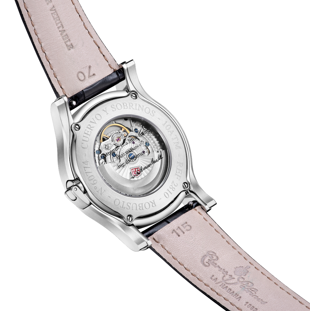 Despite their resolutely Cuban heritage, Cuervo y Sobrinos watches are still designed and engineered in Switzerland and as such, the movement within the new Cuervo y Sobrinos Robusto Churchill Day Date “Salmon Dial” watch is equipped with a Swiss made movement. The Calibre 2810.1S ensures the smooth running of the hours, minutes, seconds, day and date function while also providing a solid frequency of 28,800 vibrations per hour and a power reserve of 44 hours. You can admire many of the elements of the movement through the sapphire crystal case back including some of the 25 jewels and the engraved oscillating weight.