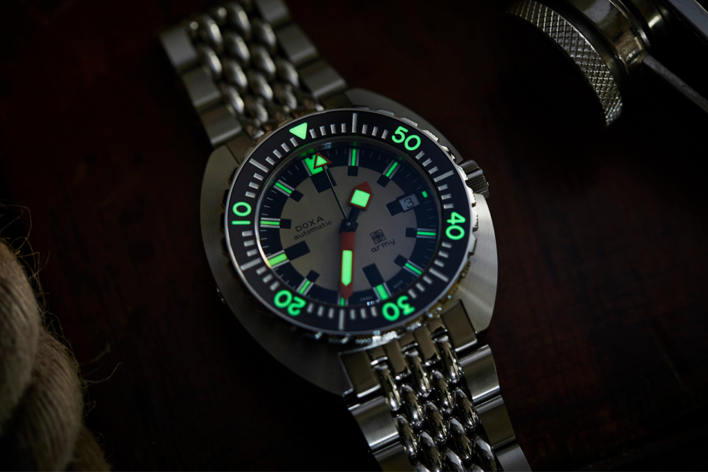 Part of their collaboration with the Swiss Army’s elite diver’s unit, DOXA also developed a dedicated tool watch aptly named the DOXA Army. It was launched during 1968 and was promoted as a watch for military divers. It had a black case, black bezel and a military-inspired sand-beige dial which together created a durable and legible instrument worthy of professional diving. Over time, the DOXA Army watch became one of the most collectible vintage DOXA watches on the market, but its scarcity made it almost impossible to find. Then, after more than fifty years since its release, DOXA partnered with Watches of Switzerland to launch a special 100-piece limited edition DOXA Army watch with a black ceramic case. The popularity of said watch has now led the way for another, this time one of a permanent nature: the DOXA Army Stainless Steel watch.