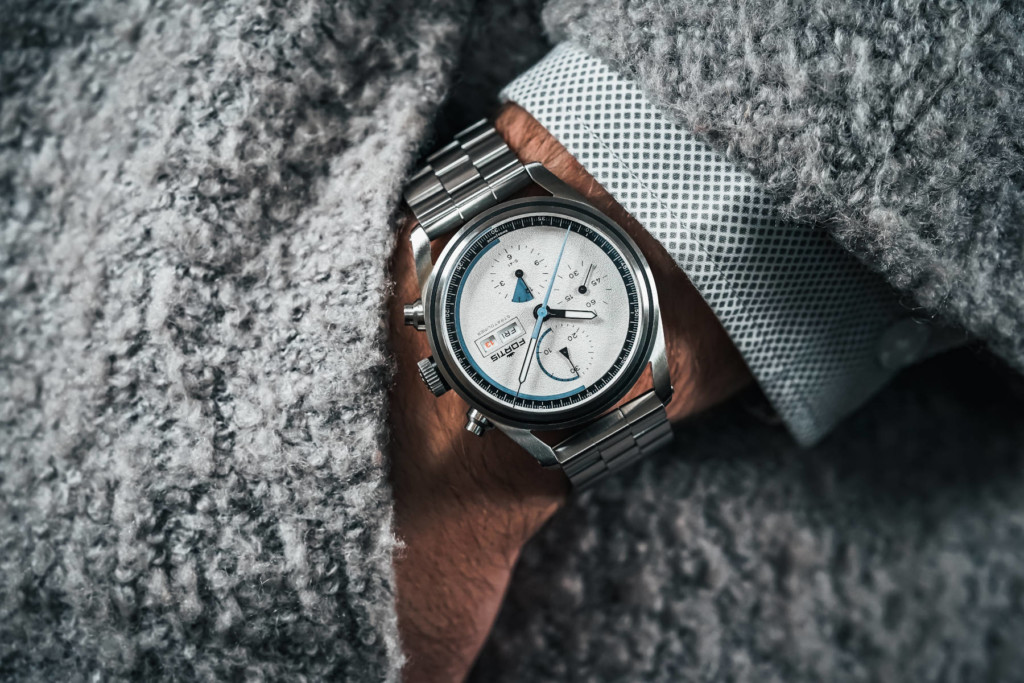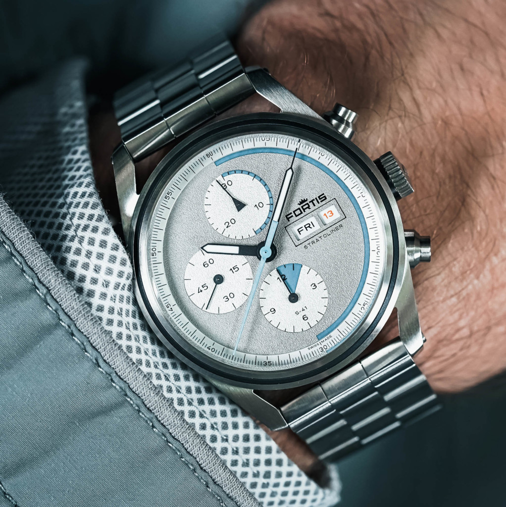It is the dial where the three Fortis Stratoliner watches differ, each following the same layout but executed in different colours. The first is the Fortis Stratoliner White Dust which offers a stark egg-shell white backdrop with matching white subsidiary dials with no visual borders. The second is the Fortis Stratoliner Cosmic Grey watch which is the most utilitarian in its design, opting for a medium grey base and darker grey, almost black, subsidary dials. Lastly, the Fortis Stratoliner Cool Grey watch features a grey centrepiece, one subtly lighter than its counterpart, paired with white counters. All the dials are grained in texture and feature syringe-tipped black hour and minute hands and a day and date display at 3 o’clock with the latter aperture featuring orange print.