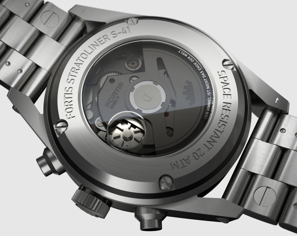 There are currently three Fortis Stratoliner watches to choose from, each offering a 41mm-wide fully brushed stainless steel case with angled lugs, broad inverted pushers and a prominent pill box crown. Together, these features give the Stratoliner a strong, unitarian look that screams resilience. The bezel is fixed and unadorned with any type of scale but features a unique black rubber stripe around its centre which nicely breaks up the otherwise monolithic profile. The case also delivers a 200 metre water resistance and sapphire crystal glass on both the front and back of the watch. The case back’s glass is smoked and features a distinctive non-tinted rounded pane above the movement’s column wheel. Circling it is an inscription that reads “Der Himmel ist nicht das Ende der Welt” which is German for “the sky is not the end of the world.”