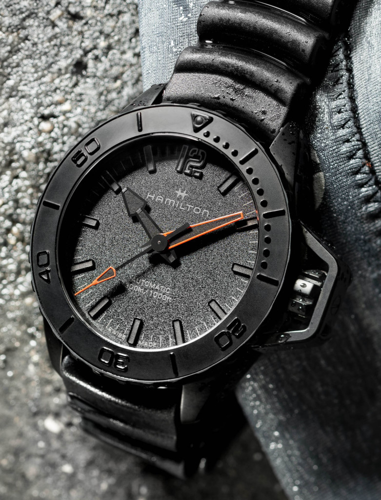 As for the dials of the new Hamilton Khaki Navy Frogman Auto 46mm watches, all four pair their stealthy-looking cases with an equally covert dial finished in a matte black grainy finish. For effortlessly legibility, the dials are then adorned with large applied indexes at all positions other than that at 12 o’clock which instead elects a large Arabic numeral with a depression extending down the number 2. The hands are also sizable with the hour indicator displayed with a blunt arrow tip, the minutes hand in orange and the needle-ended seconds hand also tipped in orange. All the hardware on the dial is coated in glow in the dark Superluminova.