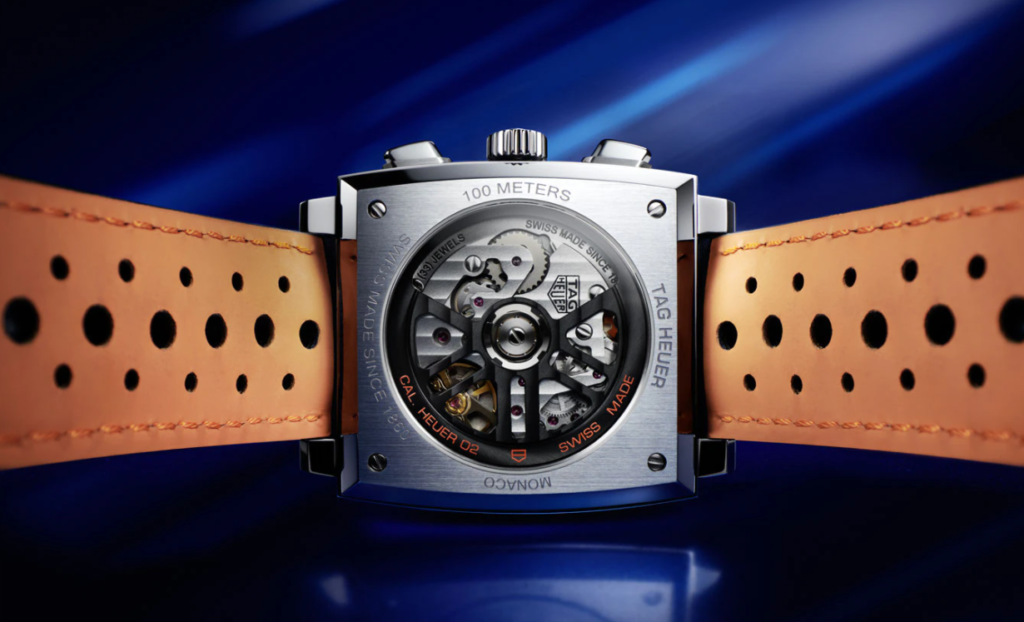 Housed within the 2022 TAG Heuer Monaco Gulf Edition watch is the Calibre Heuer 02 automatic winding movement, an in-house Swiss made calibre which before today had yet to power a Monaco Golf Edition watch. It is an integrated chronograph movement with a column wheel mechanism and vertical clutch, a power reserve of 80 hours and a frequency of 28,800vph. The movement can be admired through the exhibition case back alongside its personalised oscillating mass and column wheel which has been blackened and coloured to match the Gulf orange pantone.