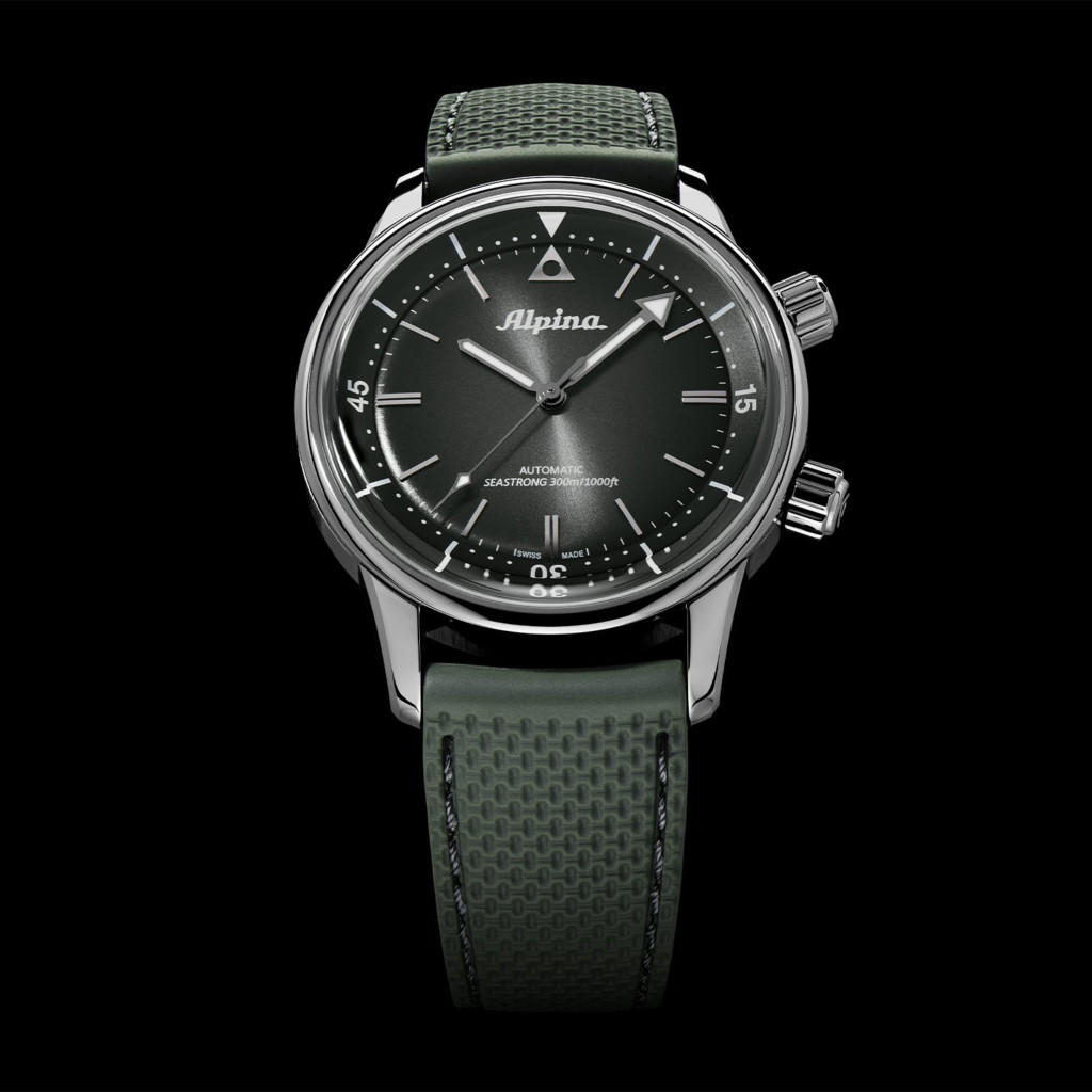 Powering the time-only dial of the Alpina Seastrong Diver 300 Heritage Green watch is the Calibre AL-520, an automatic winding movement based on the Sellita SW200-1. Alongside a frequency of 28,800 vibrations per hour and 26 jewels, we’re promised a healthy power reserve of 38 hours. Completing the green aesthetic of the new Alpina Seastrong Diver 300 Heritage watch is a green rubber strap detailed with a nice supple texture and closed by a classic stainless steel pin buckle.