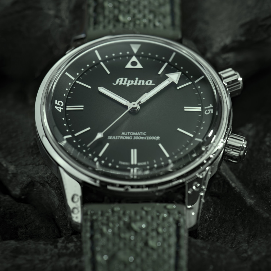 It’s safe to say that the trend for vintage-inspired watches is still strong and holding. Alpina is one of many brands that has chosen sensibly in this region, calling to all those collectors – us included- that struggle to say no to a retro timepiece. The story of the Alpina Seastrong Diver 300 Heritage Green watch that we’re looking at today began in 1969 when the Swiss watch manufacturer introduced its landmark divers watch, the Alpina Diver 10 Seastrong. Equipped with an automatic winding movement and a super-compressor case constructed by the case manufacturer Ervin Piquerez S.A. (EPSA), the design was largely defined by its two crowns, one of which was used to control the internal rotating 60 minute scale bezel. In 2016, Alpina then presented its Seastrong Diver 300 Heritage collection, a modernised version of the original super-compressor models with the same internal bezel and two crowns.