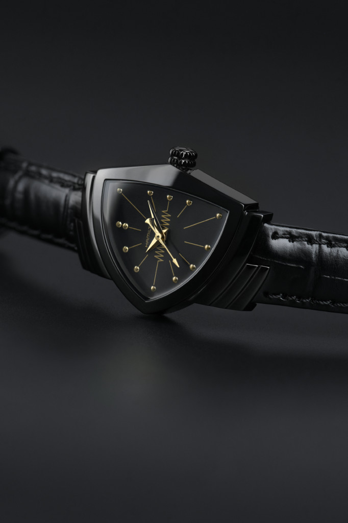 For the last two designs in the Hamilton Black & Gold Capsule collection, we’re taken back to the 1950’s with the Hamilton Ventura. Defined by its exceptionally unique shield-like or guitar-shaped case, this watch is known not only as the world’s first battery-powered watch but the timepiece loved by Elvis Presley. The king of rock famously wore the Hamilton Ventura watch in the 1961 movie Blue Hawaii. Just like the original, the new Hamilton Ventura Chrono Quartz is done in a black and gold.