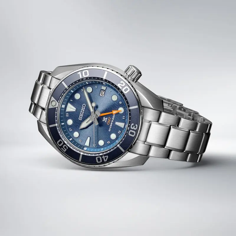 Powering the new Seiko Prospex Sumo Solar GMT Diver watches is the brand-new Calibre 5K56 movement which offers solar-quartz technology. This means the battery will never need replacing as it becomes naturally fuelled by natural or artificial light. The in-house movement also guarantees a maximum power reserve of nine months and accuracy of +/- 15 seconds a month. The GMT function is manipulated by the 4 o’clock crown and the movement of the date is tied to the local hour hand so you can correct the date in either direction if needed. The Seiko Prospex Sumo Solar GMT Diver watches are completed by traditional three-row link bracelets in stainless steel which secure by a three-fold clasp. The clasps are complete with a secure lock and push button release with extender.
