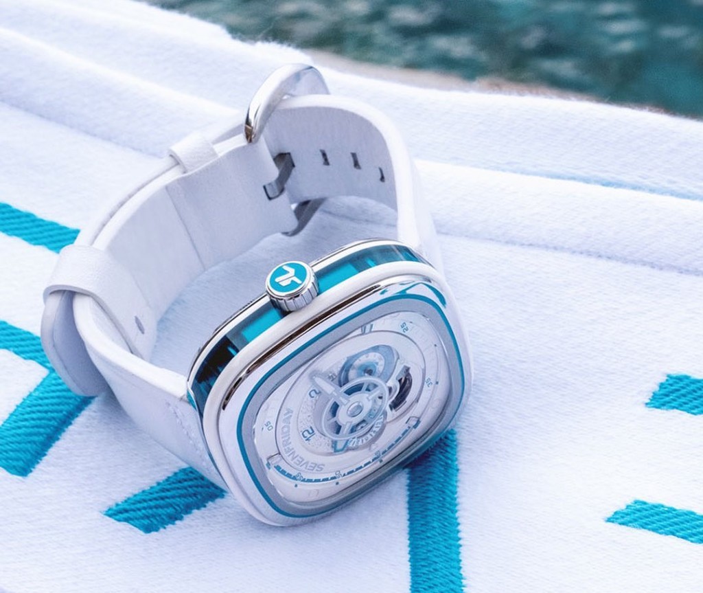 The signature 4-level dial is also handsomely adorned with the new colour palettes with blue and pink making its way across the outer minutes track, predominantly between the 40 to 60 minute section, on the hour hand, AM/PM disc and the small seconds dial. A final splash of colour is also added to the crown where the 7F logo resides. The rest of the dial is contoured with a thin chrome frame and set on an opaline white diamond-cut rhodium ring. The applied indexes at 12, 4 and 8 hours also feature white lume for readability in low lighting.