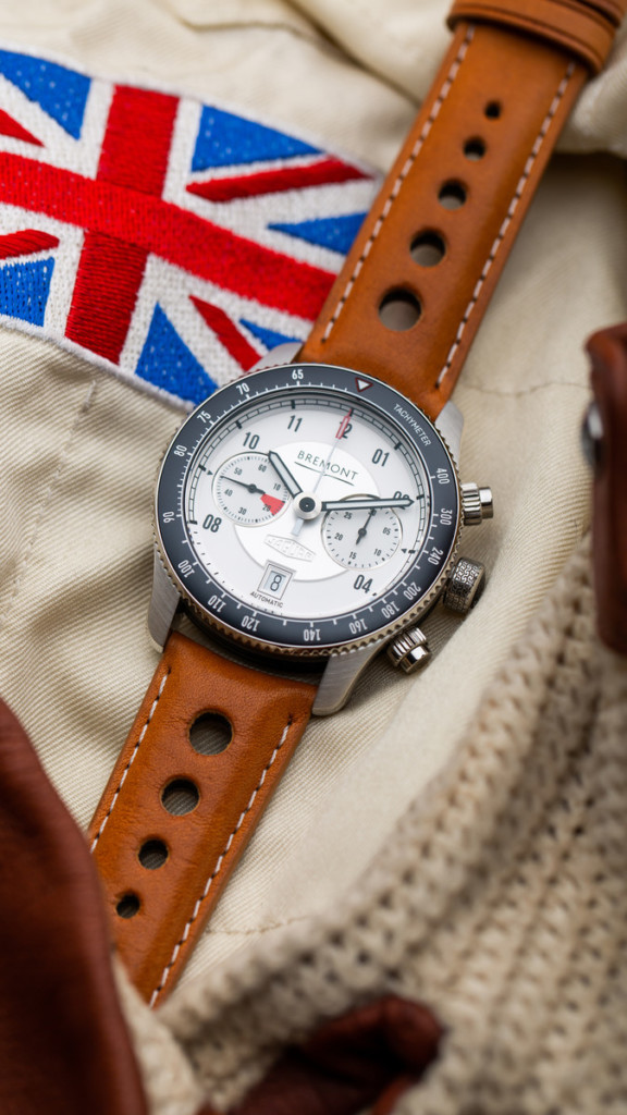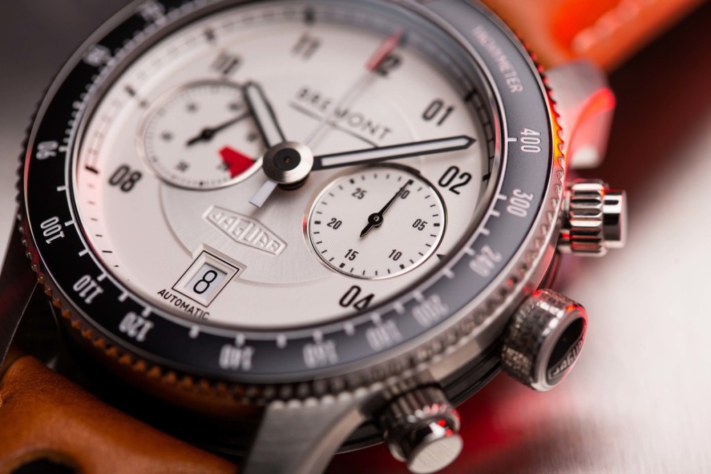 At the centre, the Bremont Jaguar C-Type watch opts for a silver-plated multi-level dial with sunburst decoration and a brushed dial ring. The Jaguar logo is embossed at 6 o’clock parallel to the Bremont emblem at the top, both surrounded by black gloss Arabic numerals and a black minutes track, the latter changes between 8 and 4 o’clock to mirror the aesthetics of a dashboard counter on a Jaguar C-Type car. The dial also reveals white subsidiary dials for the 30 minutes counter and the small seconds with the seconds detailed with a red accent to mimic the original Smiths gauges from the C-type. To suit, the central chronograph seconds hand features a C-Type-inspired needle hand in red. All timekeeping hardware, date window included, is finished in matte black, with the hour and minutes hands treated to blue emission Superluminova.