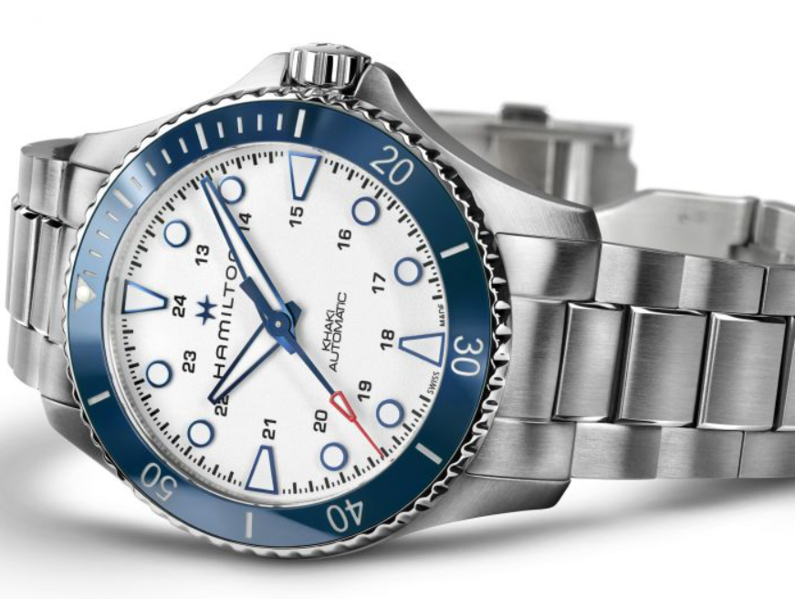Joining the new Hamilton Khaki Navy Scuba Auto 43mm series is a new white-dialled model under reference H82505150. It’s a stunning summer-ready piece “designed to inspire adventures in the sun, sand and sea.” The dial maintains the clean aesthetics of the rest of the collection but with a new blue steel treatment for a nice contrast against the paper-white backdrop. Blue steel makes up the long sword-shaped hands for the hours and minutes, the combination of round and trapezoid-shaped markers and the slender seconds hand which turns from blue to red at the tip. Much of the hardware is filled with Swiss Superluminova for additional readability in low lighting. The dial of the new Hamilton Khaki Navy Scuba Auto White watch also presents the new 24 hour scale inwards of the hour markers in black.