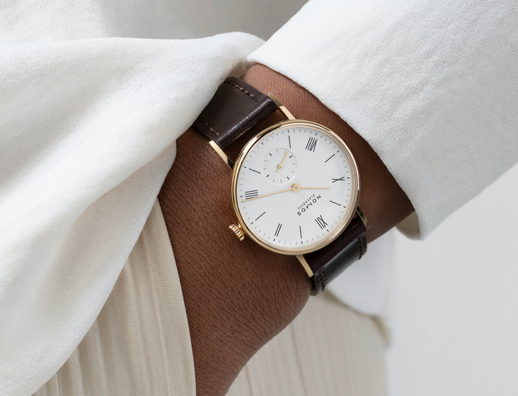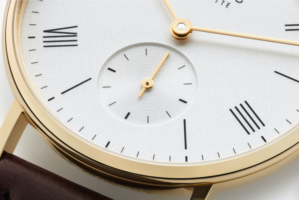 The dial is as equally stand-out as the gold case, finished in white silver-plating and dressed in minimalistic hardware for the telling of the hours, minutes and small seconds. At the centre of the NOMOS Ludwig Gold 33, two impressively slender hands demonstrate the hours and minutes while a third gold marker is placed at the centre of the snailed subsidiary dial for the seconds at 6 o’clock. The seconds track, minutes track and large Roman numerals are printed in black for the ultimate contrast against the crisp white backdrop.