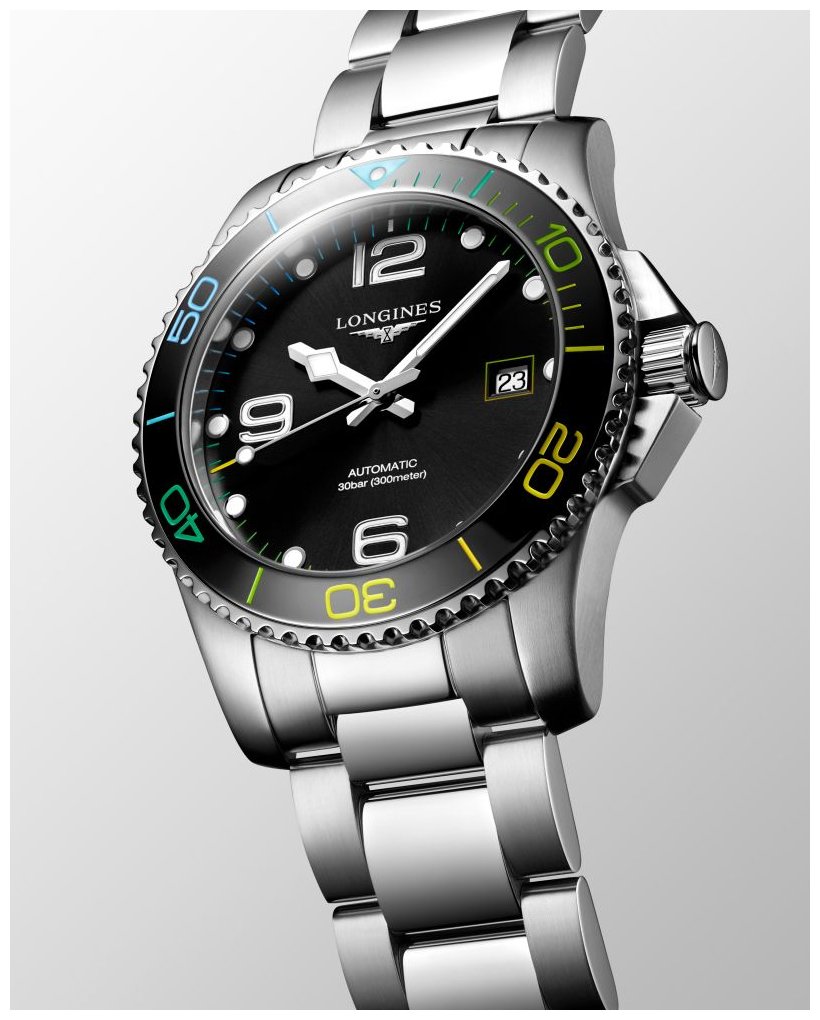 Ultimately, the Longines HydroConquest XXII Commonwealth watch revives the base of the classic 41mm HydroConquest Automatic but for a clever twist, adds a new vibrant colour scheme to the dial and bezel. The rainbow decorated 60 minute scale on the black ceramic bezel and the matching multi-coloured accented minutes track on the dial take inspiration from the colourful logo of the Commonwealth Games. There are also touches of yellow for the seconds hand and date window at 3 o’clock and white Superluminova is used on the hours, minutes and large Arabic numerals.