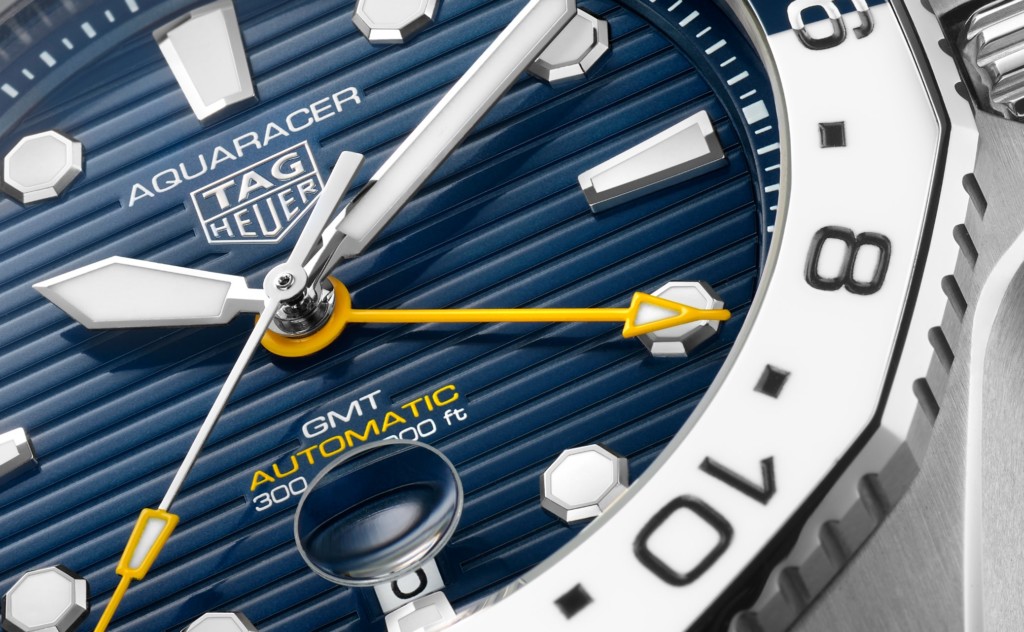 From first sight, the TAG Heuer Aquaracer Professional 300 GMT watch proves to have a different personality to its time-only predecessors. It’s blue, yellow and white colour palette is really nice and according to TAG Heuer was chosen to “represent the sky, the sun, the water and the crashing waves near the shore”. The contrast of the three colours makes reading the array of functions incredibly easy, whether you be on land or exploring the waters of a new time zone.