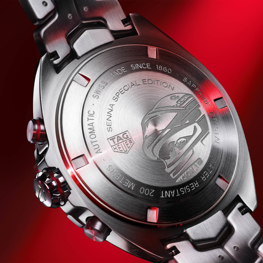 Powering the mass of complications on the dial of the TAG Heuer Formula 1 Senna 2022 watch is the Calibre 16 automatic winding movement. It’s a Swiss made movement we’ve seen several times before in the brand’s vast portfolio, largely in their Carrera Chronograph range. It runs at a frequency of 28,800vph and promises a power reserve of 42 hours. Sadly, the intricate construction of the calibre is hidden from view but instead were treated to a stunning decorated screw down case back engraved with an image of Ayrton Senna wearing his racing helmet.