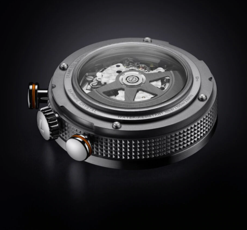 - Dial: Grained grey with orange accents