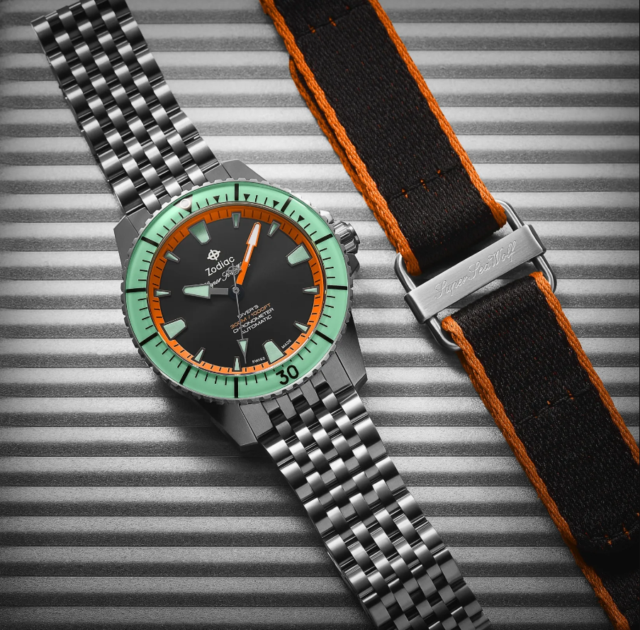 As it suggests on the dial, the movement powering the Zodiac Super Sea Wolf Titanium Pro-Diver Limited Edition is chronometer certified. The calibre in question is the Sellita SW200-1 Automatic which ensures smooth running of the time-only complications. We’re also promised a power reserve of 38 hours, 26 jewels and a frequency of 28,800 vibrations per hour. Completing the Zodiac Super Sea Wolf Titanium Pro-Diver watch is a seven-link bracelet engineered from titanium to match that of the case. The bracelet closes by a butterfly clasp. You’ll also receive a complimentary black and orange NATO strap with every order.